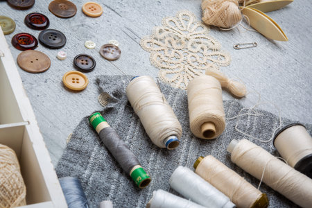 Set of sewing supplies on a gray table: sewing thread, buttons, gray cloth, white box.