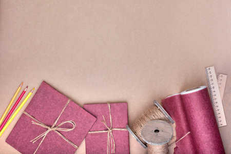 Gift wrapping set on pink. A set of items for gift decoration. Flat lay top view