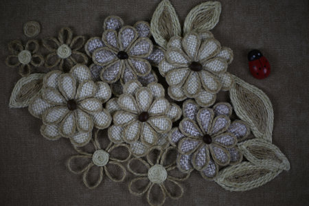 Needlework, crafts. A painting created by hand from natural materials on a dark background. Eco-creation and creativity. Horizontal photo.
