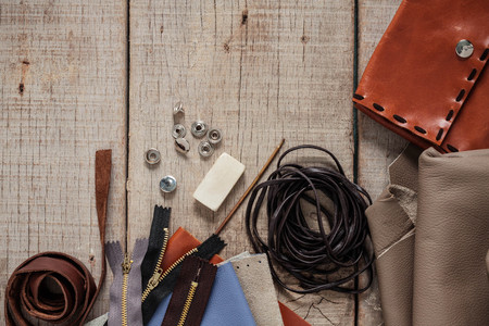 work in leather shop on dark wooden background close up