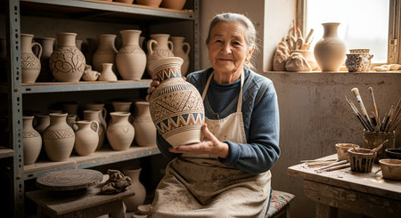 A proud elderly woman, a traditional potter, sits in her workshop and holds up a beautifully decorated handmade clay vase. Surrounded by her creations, she embodies the spirit of craftsmanship, heritage, artistry, and small business ownership.