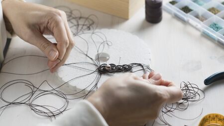 Lifestyle concept, work from home to reinvent your life: close-up of woman hands making macrame knotted jewelry with stone beads and tools on light wooden table