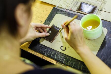 brunette woman smearing with glue a part of a purse with a brush on the wooden table. manufacturing process. close-up photo