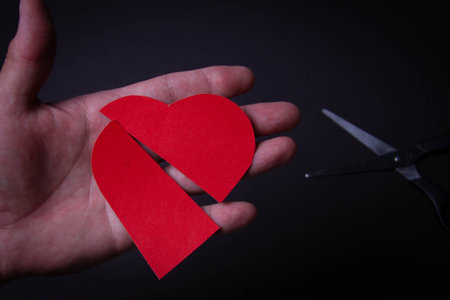 Broken heart. Divorce of a married couple. Broken marriage. Heart in hand and scissors.
