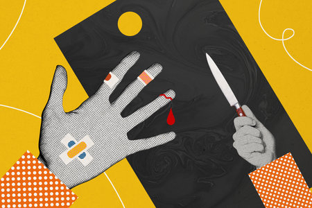 Composite photo collage of kitchen accident injured hands fingers flow blood healthcare cutting board knife isolated on painted background