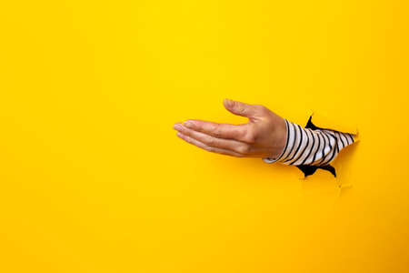 African american man stretching open palm through hole in torn yellow paper, offering helping hand, asking for charity