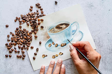 Watercolor sketch of a cup of coffee. Woman hands with a paintbrush drawing coffee cup with watercolor. Flat lay top view