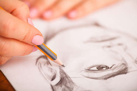 Closeup of drawing mans portrait at the desk