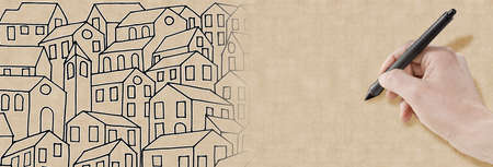 Imaginary city inspired by the old italian Tuscan towns - Web banner design concept with hand and pen - I'm the copyright owner of the graffiti images used in this picture