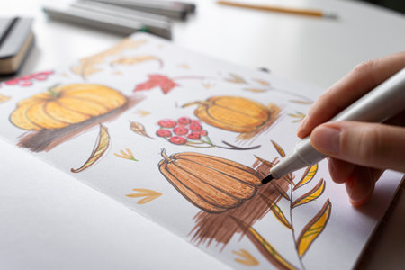 Hand coloring autumn illustration with markers