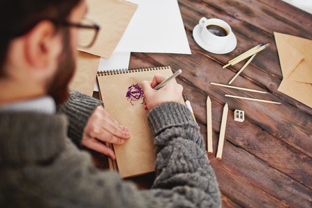 Interior scene of adult artist sketching his next artwork at workshop