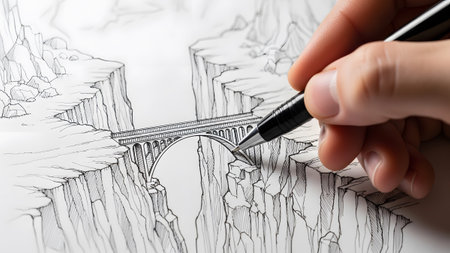 Hand making a perspective drawing with black and white figures by taking a black pencil.