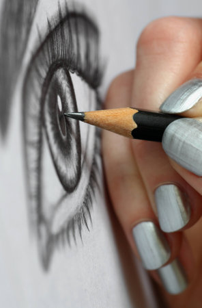 Close up of woman hand drawing an eye with graphite pencil