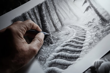 A skilled artist uses a pencil to bring to life a beautiful forest pathway surrounded by tall trees and ferns.