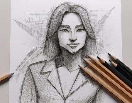 Two artists focus on a detailed sketch of a woman, one holding a pencil, in a creative workshop.