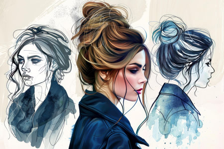 Digital painting showcases a womans profile with stylish updo, includes sketch versions