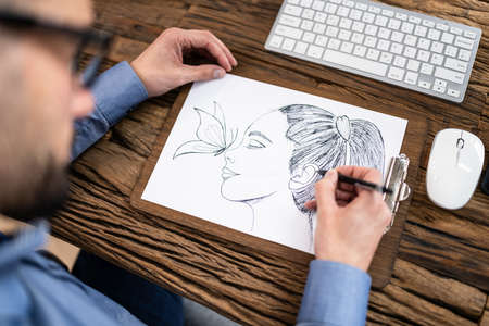 The fashion designer sketched creative ideas for the clothing collection generated by artificial intelligence