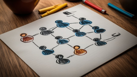 This image features a hand-drawn network connection diagram on a wooden table, surrounded by office supplies, illustrating teamwork and collaboration ideas.