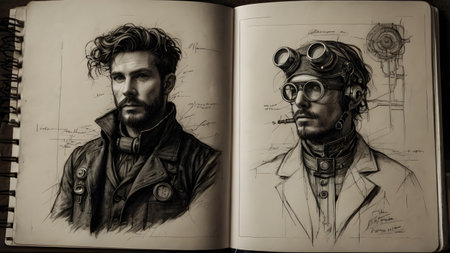 Open sketchbook reveals unfinished graphite drawings featuring multiple portraits and facial expressions, with tools nearby creating an artistic atmosphere.
