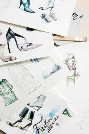 Extreme close up of sketch drawings in tailoring studio showing cool stylish clothing. Skilled couturiers coming up with ideas for upcoming creative fashion design runway show