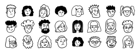 Faces people different avatars doodle hand drawn icon set. Outline drawing head people line clipart symbol collection