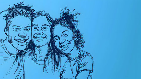 A hand-drawn illustration captures a group of diverse women smiling joyfully, expressing happiness and unity among friends.