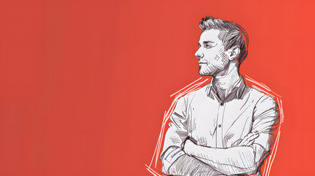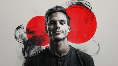 A man with short dark hair and a slight smile stands against a minimalist light gray background. Red speech bubble cutouts and abstract black loops enhance his graphic outline.