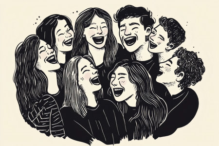 Linocut illustration of diverse young students laughing out loud, expressing joy and friendship