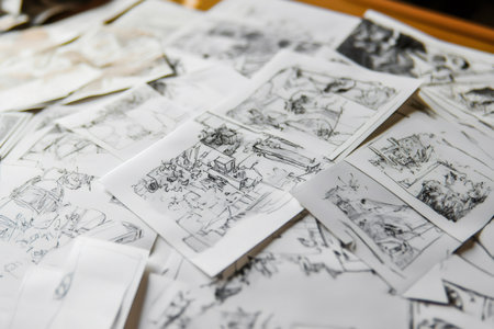 Many storyboard sketches lying on a table, showing the creative process of an illustrator developing visual narrative for a film or animation