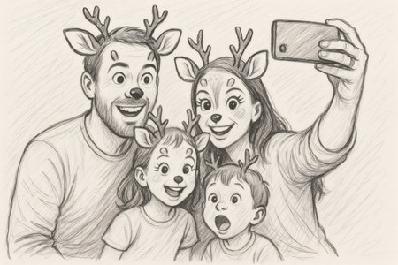 Happy family selfie sketch of parents and children in reindeer costumes celebrating a joyful Christmas holiday together