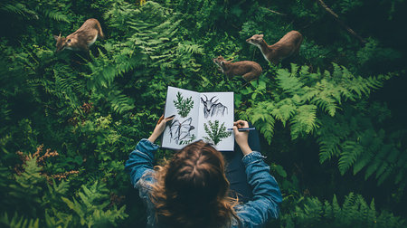 This close-up shot captures a hand meticulously drawing with a pencil on paper, showcasing the artist's creative process and attention to detail. The drawing is intricate and imaginative.
