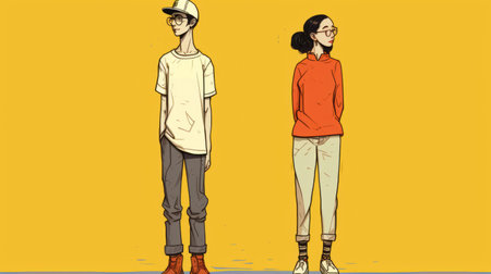two men and women, in a quirky cartoonish style, stand next to each other. the illustration features a light yellow color palette with normcore elements. the colors are saturated, creating a vibrant look. the use of shading is subtle, with hints of light red and light gray. the composition creates a sense of both long and deep distance. ai generated