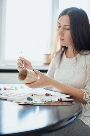 woman master paints the dishes at the workshop. clay teapot. handwork. Studio. design