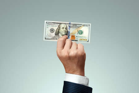Businessman's hand holding a hundred dollar bill. The concept of salary, investment, donation