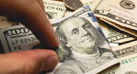 Hand holding a hundred dollar bill, showing the face of Benjamin Franklin. Extreme macro close up.