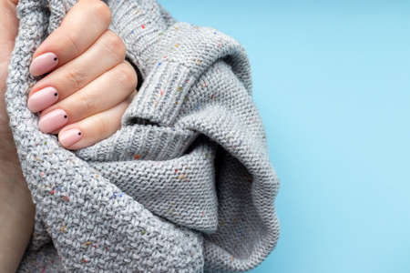 Female hand in a gray knitted sweater fabric with trendy beautiful manicure - pink nude nails with black small dots on a blue background with copy space. Selective focus. Closeup view