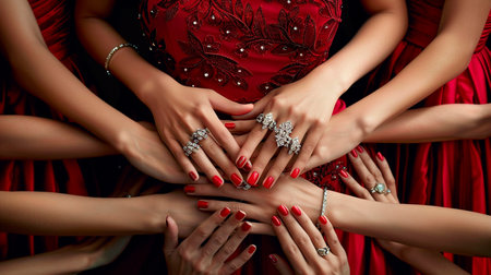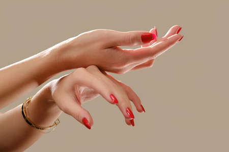 Female hand with beautiful manicure and jewelry on red background with space for text