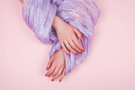Stylish trendy purple female manicure. Young woman hands on the purple background, banner size