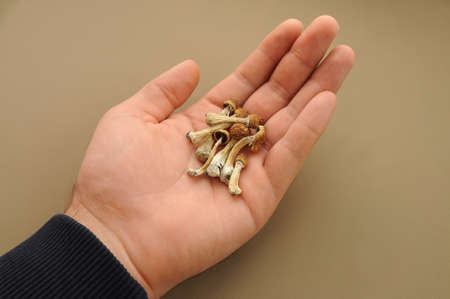 Psilocybin Psilocybe Cubensis mushrooms in man's hand on brown background. Psychedelic magic mushroom Golden Teacher. Top view, flat lay. Micro-dosing concept.