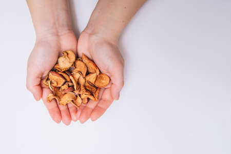 Female hands with sliced dried garden apples. Dried fruits. Healthy, natural foods. White background. Close-up. nice