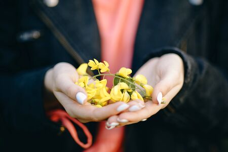 Hands of a young woman in a yellow sweater on the street.