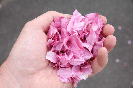Hand holding cherry blossom petals in Kyoto, Japan. Japanese cherry blossoms.
