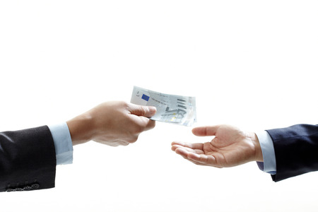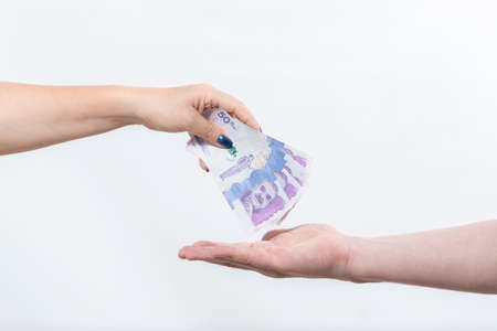 Bribery. A woman's hand gives a bribe a man's hand in a shirt the color of the Russian flag. Side view. White background. Concept of world anti-corruption day, December 9.