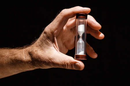 Male hand holding hourglass with sand running through the glass, time passing concept