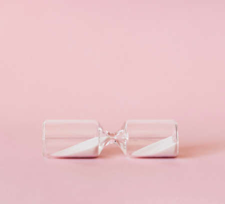 Hourglass on pink background, white sand in sandglass measuring time. minimal concept.