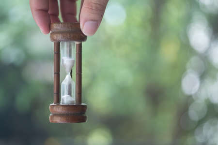 Man hand holding wooden hourglass against nature background. Concept of running out of time