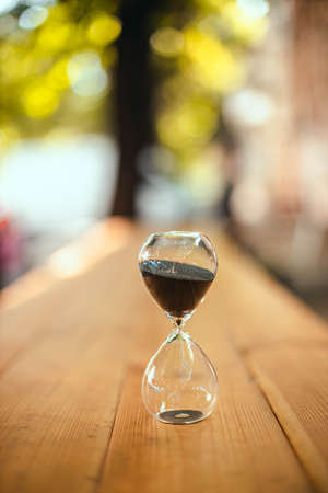 Hourglass on wooden table outdoors in the rays of sunlight