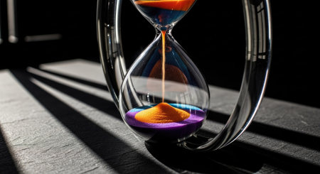 A black-and-white hourglass close-up measuring time with flowing sand