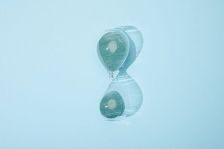 hourglass on blue and white background with shadow. concept of decision making and deadline. running and measuring passing time style.