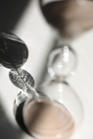 Hourglass on the desk Striking light, shadow and glass reflections